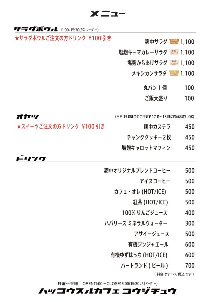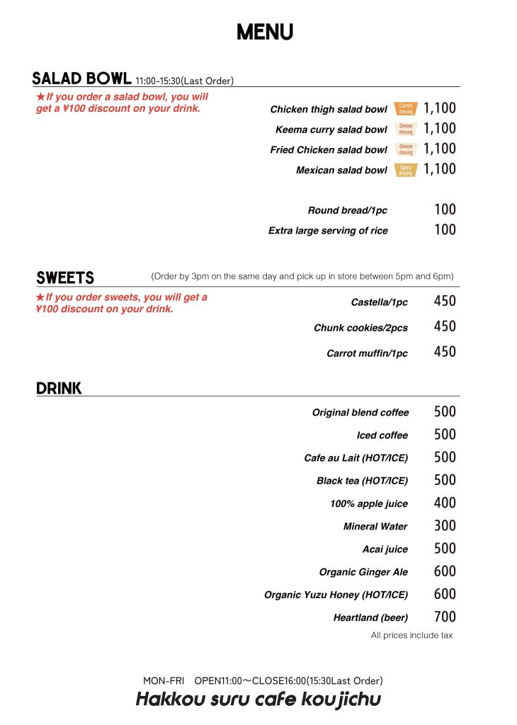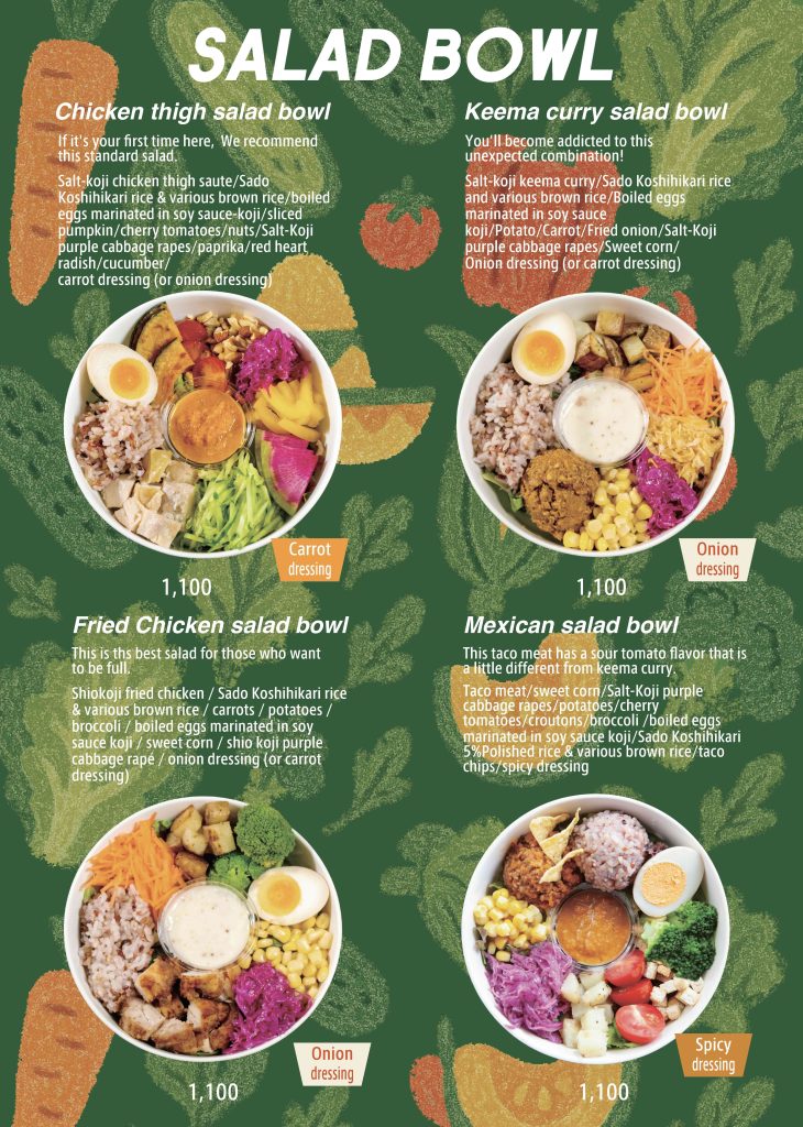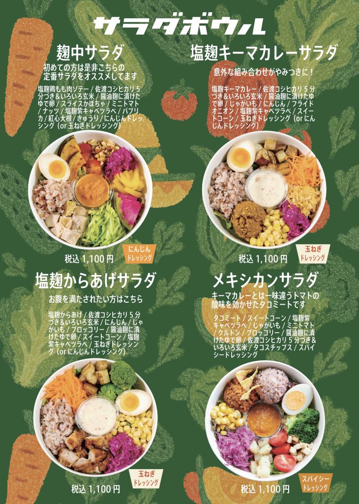 メニュー / MENU UberEatsでご注文頂けます 9月10月メニュー 9月10月メニュー Sep&Oct menu Sep&Oct menu ・当日のメニューはInstagramにてご確認ください。 ・サラダボウルは無くなり次第終了です。 ・エコバッグをご持参にご協力ください。 アクセスへ